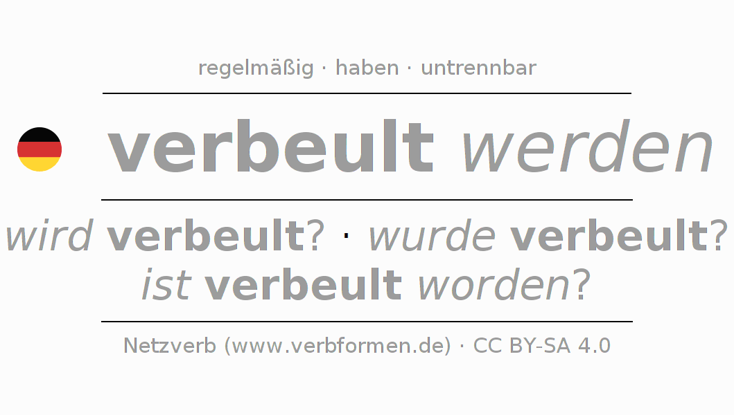 Die Konjugation von verbeulen im Partizip Präsens Perfekt Mittelwort Vorgangspassiv ist: verbeult werdend, verbeult worden.Die Bildung dieser Formen entspricht gewissen grammatischen Regeln. So auch die Vorgaben zur Konjugation der einfachen Verbformen von verbeulen im Partizip. Kommentare ☆