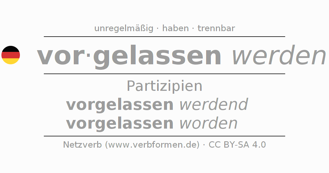 Das Verb vorlassen vollständig in allen Personen und Numeri im Partizip Präsens Perfekt konjugiert