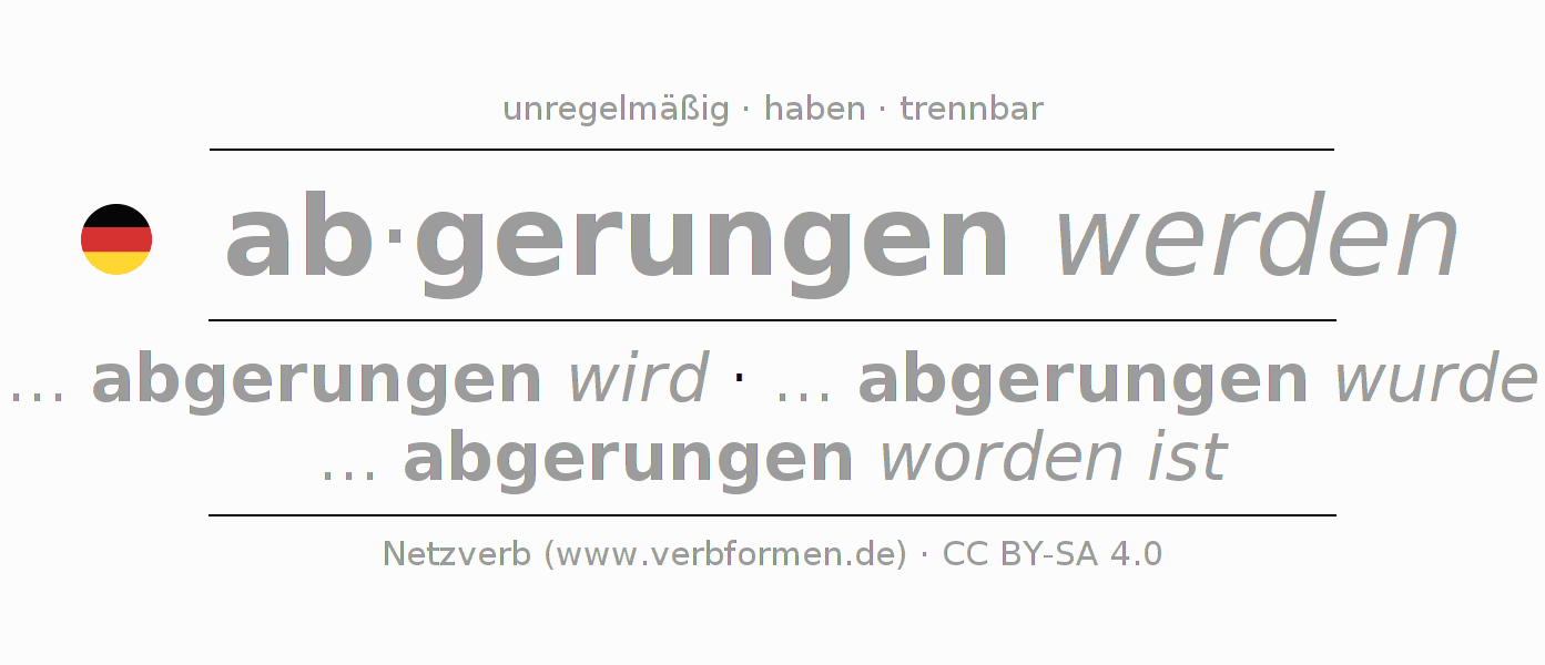 Die Konjugation von abringen im Partizip Präsens Perfekt Mittelwort Vorgangspassiv ist: abgerungen werdend, abgerungen worden.Die Bildung dieser Formen entspricht gewissen grammatischen Regeln. So auch die Vorgaben zur Konjugation der einfachen Verbformen von abringen im Partizip. Kommentare ☆