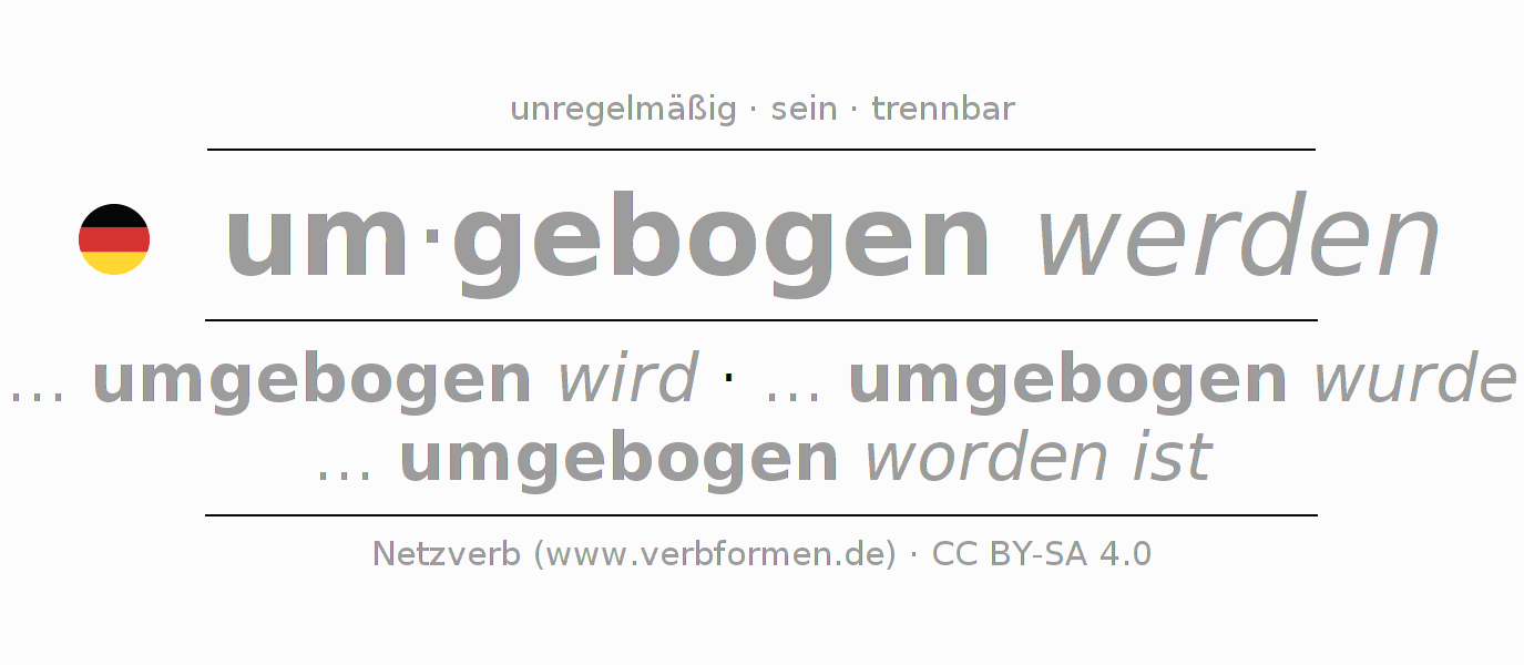 Die Konjugation von umbiegen im Partizip Präsens Perfekt Mittelwort Vorgangspassiv ist: umgebogen werdend, umgebogen worden.Die Bildung dieser Formen entspricht gewissen grammatischen Regeln. So auch die Vorgaben zur Konjugation der einfachen Verbformen von umbiegen im Partizip. Kommentare ☆