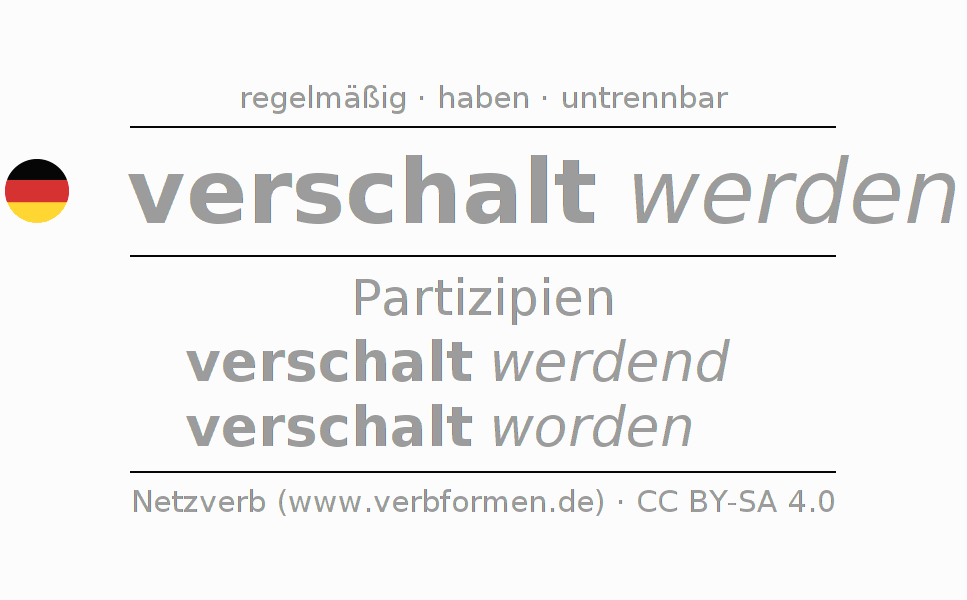 Die Konjugation von verschalen im Partizip Präsens Perfekt Mittelwort Vorgangspassiv ist: verschalt werdend, verschalt worden.Die Bildung dieser Formen entspricht gewissen grammatischen Regeln. So auch die Vorgaben zur Konjugation der einfachen Verbformen von verschalen im Partizip. Kommentare ☆