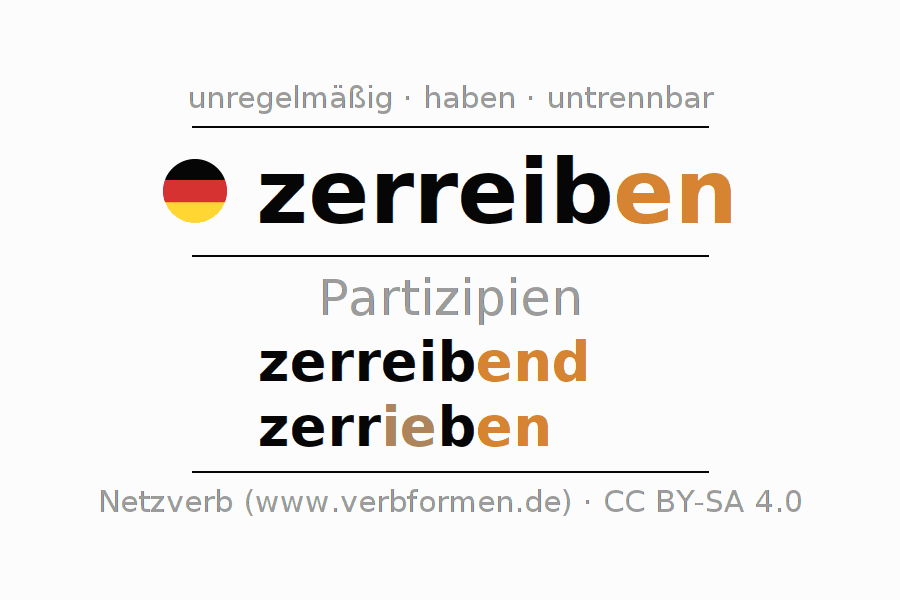 Das Verb zerreiben vollständig in allen Personen und Numeri im Partizip Präsens Perfekt konjugiert