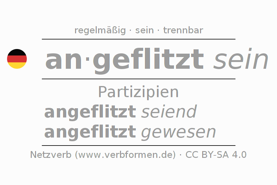 Das Verb anflitzen vollständig in allen Personen und Numeri im Partizip Präsens Perfekt konjugiert