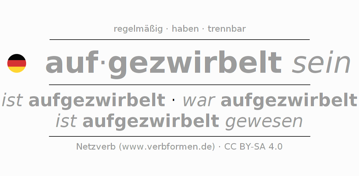 Das Verb aufzwirbeln vollständig in allen Personen und Numeri im Partizip Präsens Perfekt konjugiert