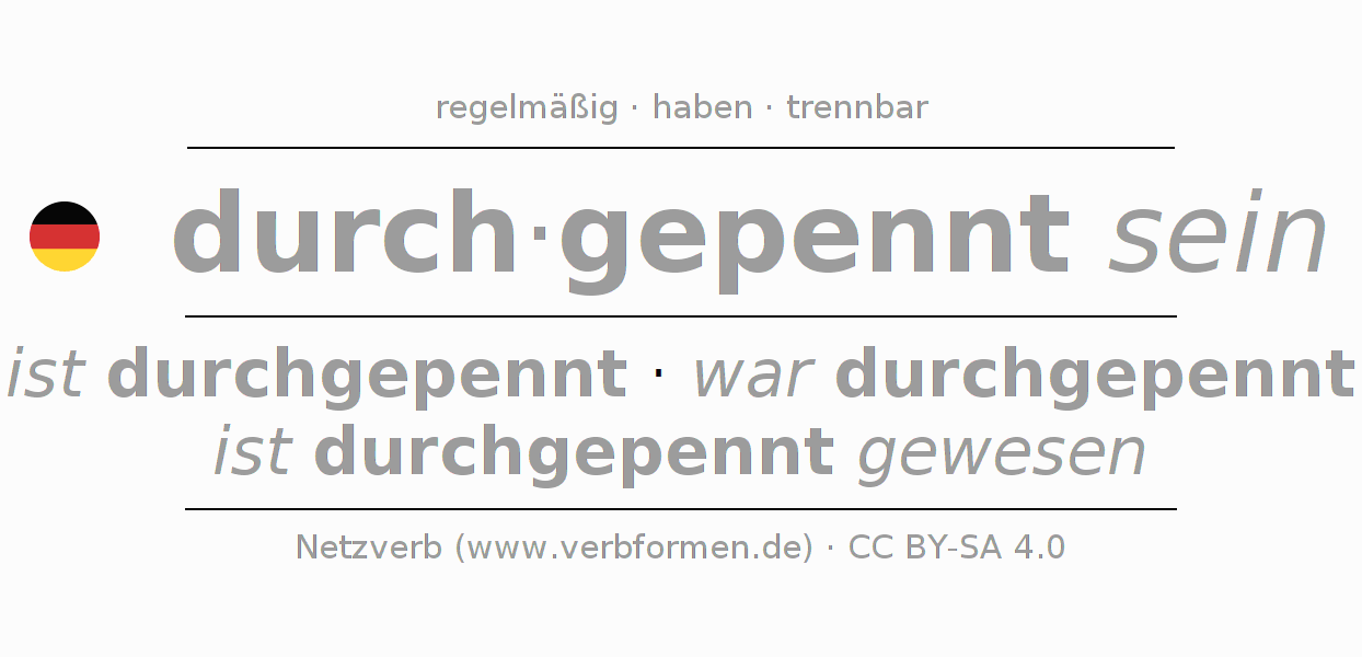 Das Verb durchpennen vollständig in allen Personen und Numeri im Partizip Präsens Perfekt konjugiert