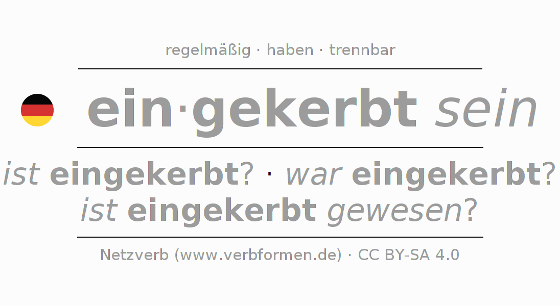 Das Verb einkerben vollständig in allen Personen und Numeri im Partizip Präsens Perfekt konjugiert