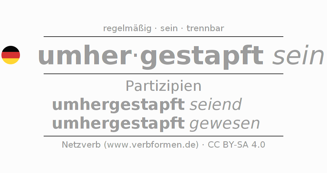 Das Verb umherstapfen vollständig in allen Personen und Numeri im Partizip Präsens Perfekt konjugiert