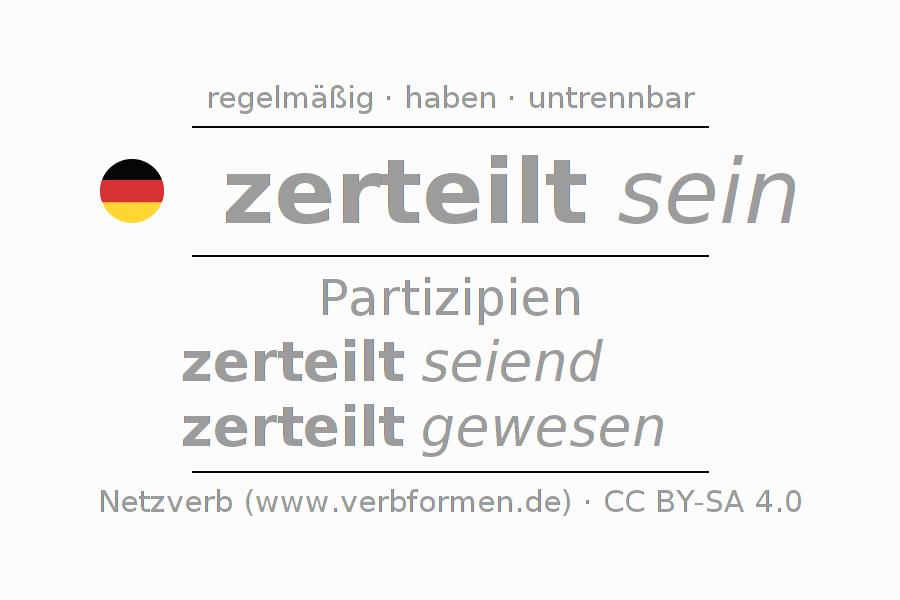 Das Verb zerteilen vollständig in allen Personen und Numeri im Partizip Präsens Perfekt konjugiert