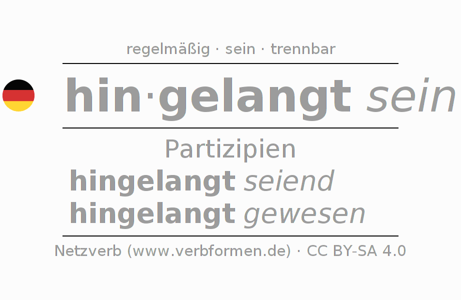 Das Verb hingelangen vollständig in allen Personen und Numeri im Partizip Präsens Perfekt konjugiert