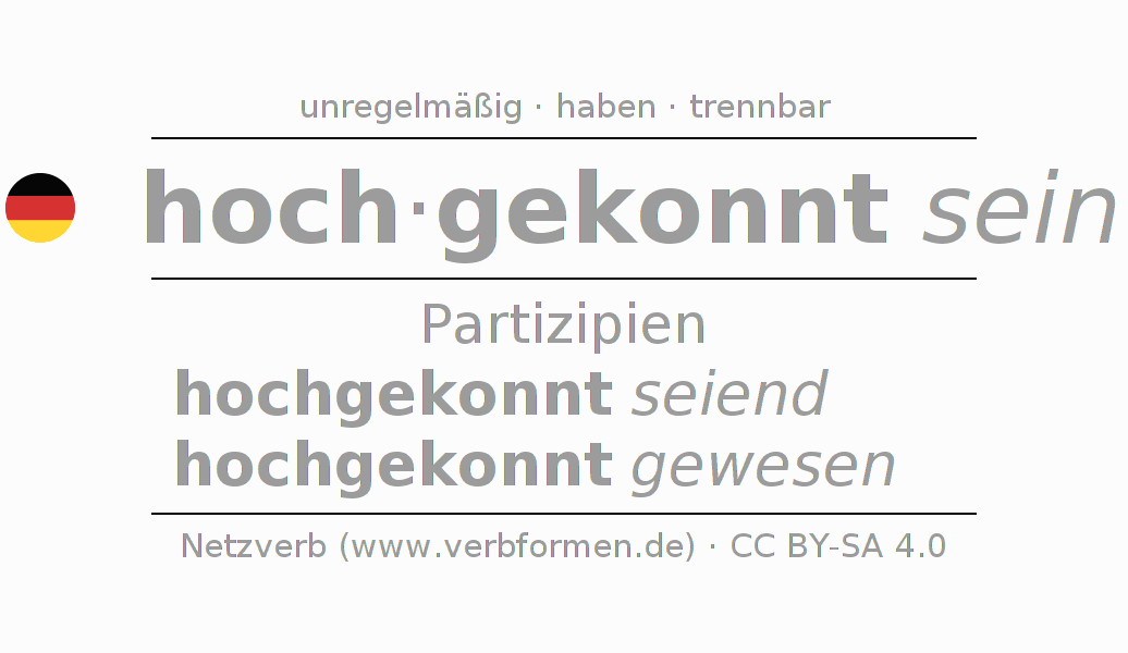 Die Konjugation von hochkönnen im Partizip Präsens Perfekt Mittelwort Zustandspassiv ist: hochgekonnt seiend, hochgekonnt gewesen.Die Bildung dieser Formen entspricht gewissen grammatischen Regeln. So auch die Vorgaben zur Konjugation der einfachen Verbformen von hochkönnen im Partizip. Kommentare ☆