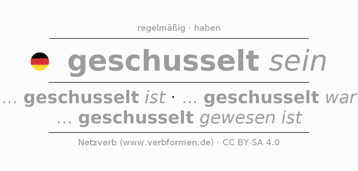 Das Verb schusseln (hat) vollständig in allen Personen und Numeri im Partizip Präsens Perfekt konjugiert
