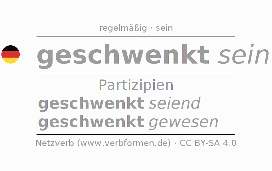 Die Konjugation von schwenken im Partizip Präsens Perfekt Mittelwort Zustandspassiv ist: geschwenkt seiend, geschwenkt gewesen.Die Bildung dieser Formen entspricht gewissen grammatischen Regeln. So auch die Vorgaben zur Konjugation der einfachen Verbformen von schwenken im Partizip. Kommentare ☆