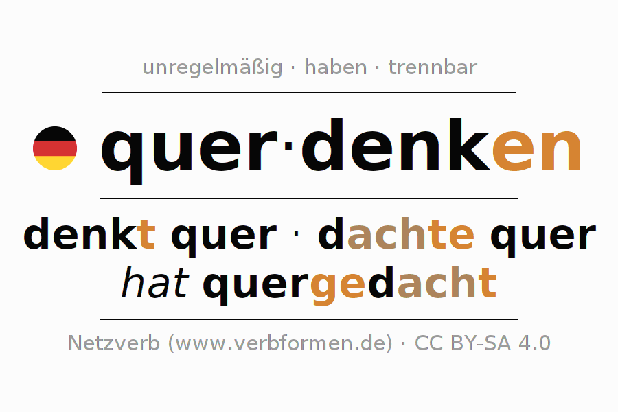 - Präsens: denk(e) (du) quer, denken wir quer, denkt (ihr) quer, denken Sie quer