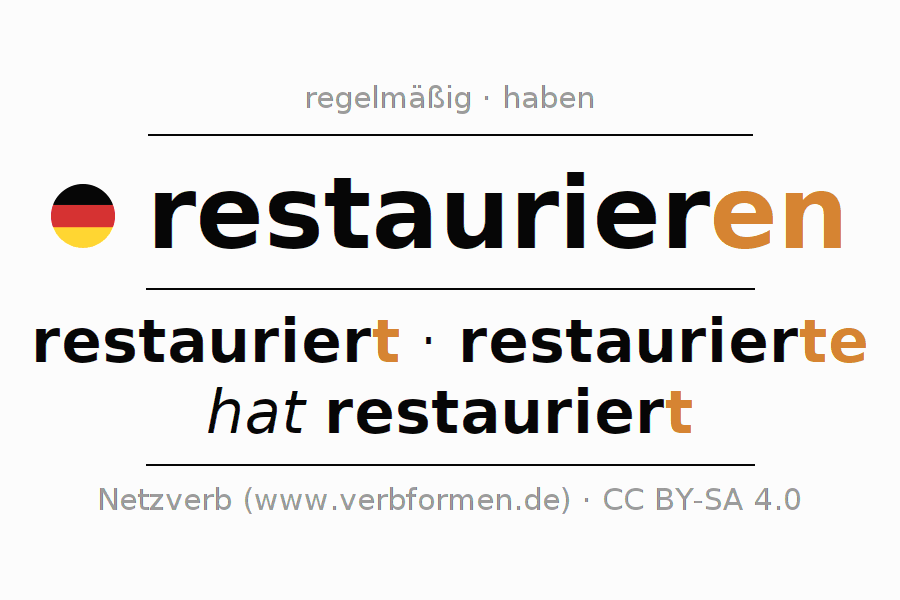 - Perfekt: ich habe restauriert, du hast restauriert, er hat restauriert, wir haben restauriert, ihr habt restauriert, sie haben restauriert