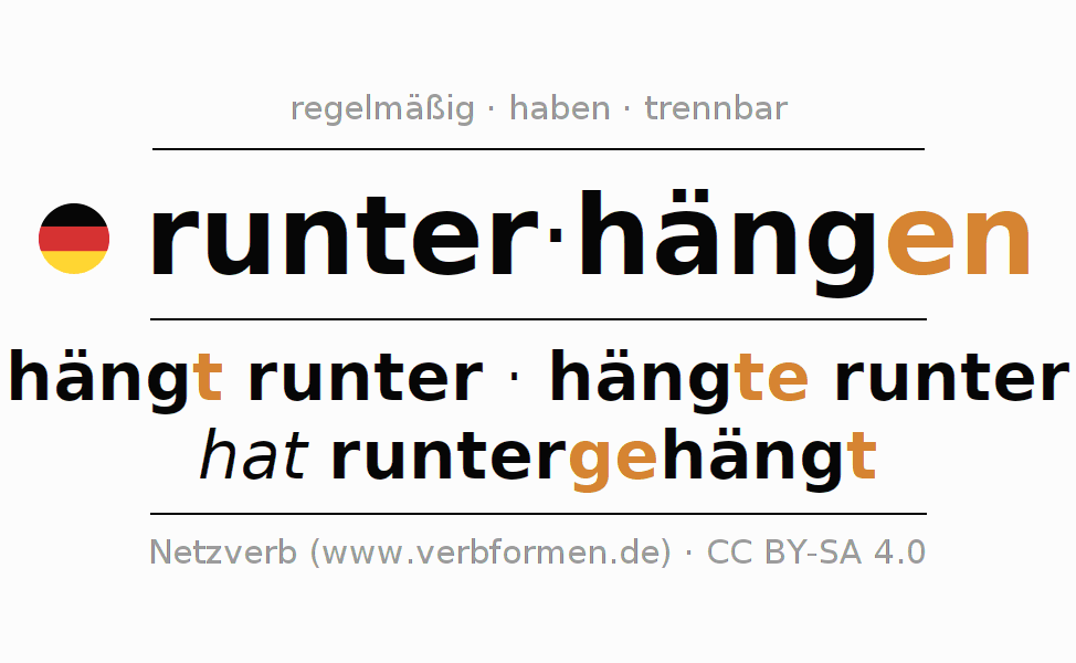 - Präsens: häng(e) (du) runter, hängen wir runter, hängt (ihr) runter, hängen Sie runter