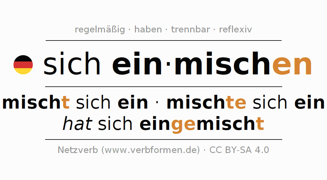 - Präsens: misch(e) (du) dir/dich ein, mischen wir uns ein, mischt (ihr) euch ein, mischen Sie sich ein