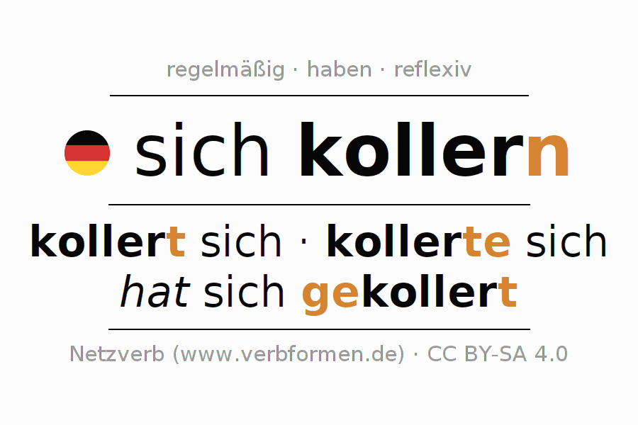 - Perfekt: ich habe mir/mich gekollert, du habest dir/dich gekollert, er habe sich gekollert, wir haben uns gekollert, ihr habet euch gekollert, sie haben sich gekollert