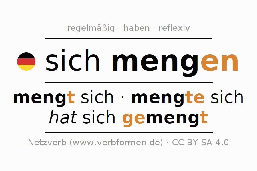 - Futur I: ich werde mir/mich mengen, du wirst dir/dich mengen, er wird sich mengen, wir werden uns mengen, ihr werdet euch mengen, sie werden sich mengen