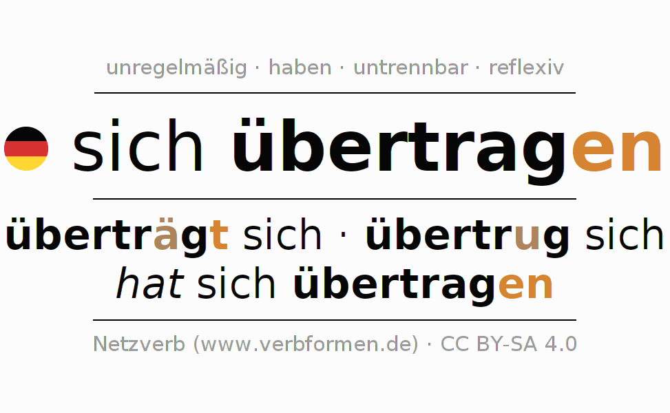 - Futur II: ich werde mir/mich übertragen haben, du wirst dir/dich übertragen haben, er wird sich übertragen haben, wir werden uns übertragen haben, ihr werdet euch übertragen haben, sie werden sich übertragen haben
