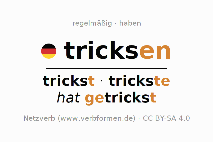 - Futur II: ich werde getrickst haben, du werdest getrickst haben, er werde getrickst haben, wir werden getrickst haben, ihr werdet getrickst haben, sie werden getrickst haben