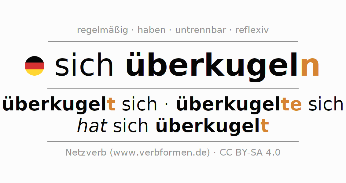 - Futur II: ich werde mir/mich überkugelt haben, du werdest dir/dich überkugelt haben, er werde sich überkugelt haben, wir werden uns überkugelt haben, ihr werdet euch überkugelt haben, sie werden sich überkugelt haben