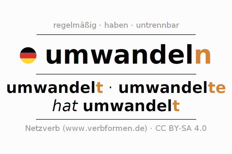 Das Konjugieren des Verbs umwandeln erfolgt regelmäßig. Die Stammformen sind umwandelt, umwandelte und hat umwandelt. Als Hilfsverb von umwandeln wird "haben" verwendet. Die Vorsilbe um- von umwandeln ist untrennbar. Sie kann aber auch trennbar auftreten. Die Beugung erfolgt im Aktiv und die Darstellung als Hauptsatz. Zum besseren Verständnis stehen unzählige Beispiele für das Verb umwandeln zur Verfügung. Zum Üben und Festigen gibt es außerdem kostenlose Arbeitsblätter für umwandeln. Man kann nicht nur umwandeln konjugieren, sondern alle deutschen Verben. Das Verb gehört zum Wortschatz des Zertifikats Deutsch bzw. zur Stufe C2. Kommentare ☆