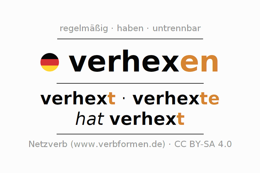 - Futur II: ich werde verhext haben, du wirst verhext haben, er wird verhext haben, wir werden verhext haben, ihr werdet verhext haben, sie werden verhext haben