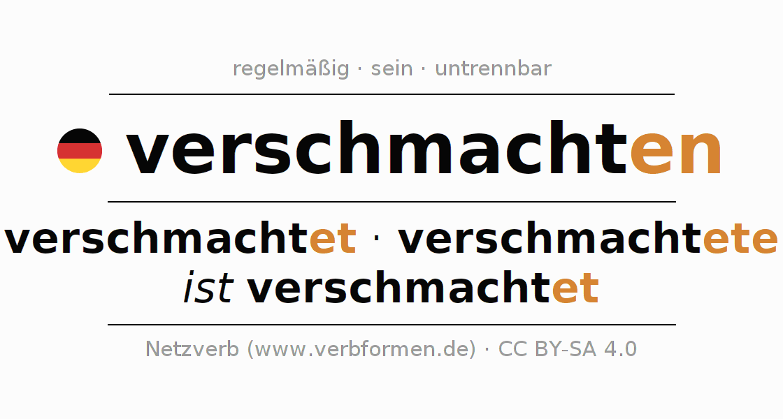 Die verschmachten Konjugation online als Verbtabelle mit allen Verbformen in Singular (Einzahl) und Plural (Mehrzahl) in allen Personen (1. Person, 2.Person, 3. Person) übersichtlich dargestellt. Die Beugung bzw. Flexion des Verbs verschmachten ist somit eine Hilfestellung für Hausaufgaben, Prüfungen, Klausuren, für den Deutschuntericht der Schule, zum Deutsch Lernen, für das Studium, Deutsch als Fremdsprache (DaZ), Deutsch als Zweitsprache (DaZ) und für die Erwachsenenbildung. Gerade auch für Deutschlernende ist die korrekte Konjugation des Verbs bzw. die korrekt flektierten Formen (verschmachtet - verschmachtete - ist verschmachtet) entscheidend. Weitere Informationen finden sich unter Wiktionary verschmachten und unter verschmachten im Duden.