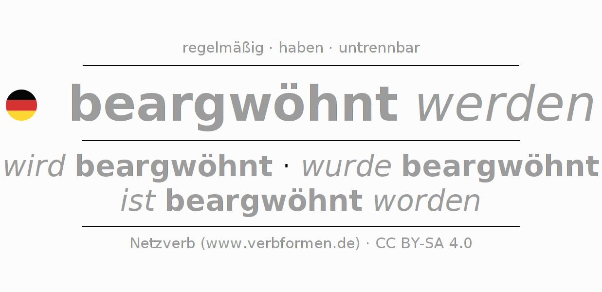 Die beargwöhnt werden Konjugation online als Verbtabelle mit allen Verbformen in Singular (Einzahl) und Plural (Mehrzahl) in allen Personen (1. Person, 2.Person, 3. Person) übersichtlich dargestellt. Die Beugung bzw. Flexion des Verbs beargwöhnt werden ist somit eine Hilfestellung für Hausaufgaben, Prüfungen, Klausuren, für den Deutschuntericht der Schule, zum Deutsch Lernen, für das Studium, Deutsch als Fremdsprache (DaZ), Deutsch als Zweitsprache (DaZ) und für die Erwachsenenbildung. Gerade auch für Deutschlernende ist die korrekte Konjugation des Verbs bzw. die korrekt flektierten Formen (wird beargwöhnt - wurde beargwöhnt - ist beargwöhnt worden) entscheidend. Weitere Informationen finden sich unter Wiktionary beargwöhnen und unter beargwöhnen im Duden.