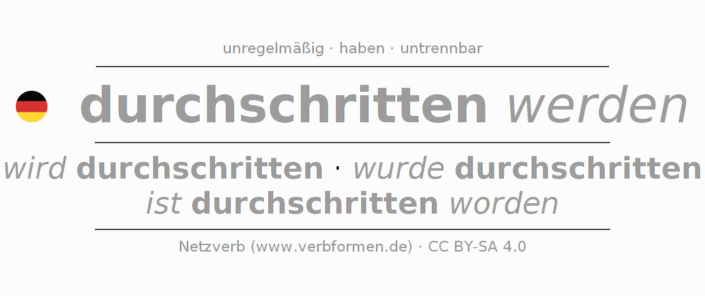 Die durchschritten werden Konjugation online als Verbtabelle mit allen Verbformen in Singular (Einzahl) und Plural (Mehrzahl) in allen Personen (1. Person, 2.Person, 3. Person) übersichtlich dargestellt. Die Beugung bzw. Flexion des Verbs durchschritten werden ist somit eine Hilfestellung für Hausaufgaben, Prüfungen, Klausuren, für den Deutschuntericht der Schule, zum Deutsch Lernen, für das Studium, Deutsch als Fremdsprache (DaZ), Deutsch als Zweitsprache (DaZ) und für die Erwachsenenbildung. Gerade auch für Deutschlernende ist die korrekte Konjugation des Verbs bzw. die korrekt flektierten Formen (wird durchschritten - wurde durchschritten - ist durchschritten worden) entscheidend. Weitere Informationen finden sich unter Wiktionary durchschreiten und unter durchschreiten im Duden.
