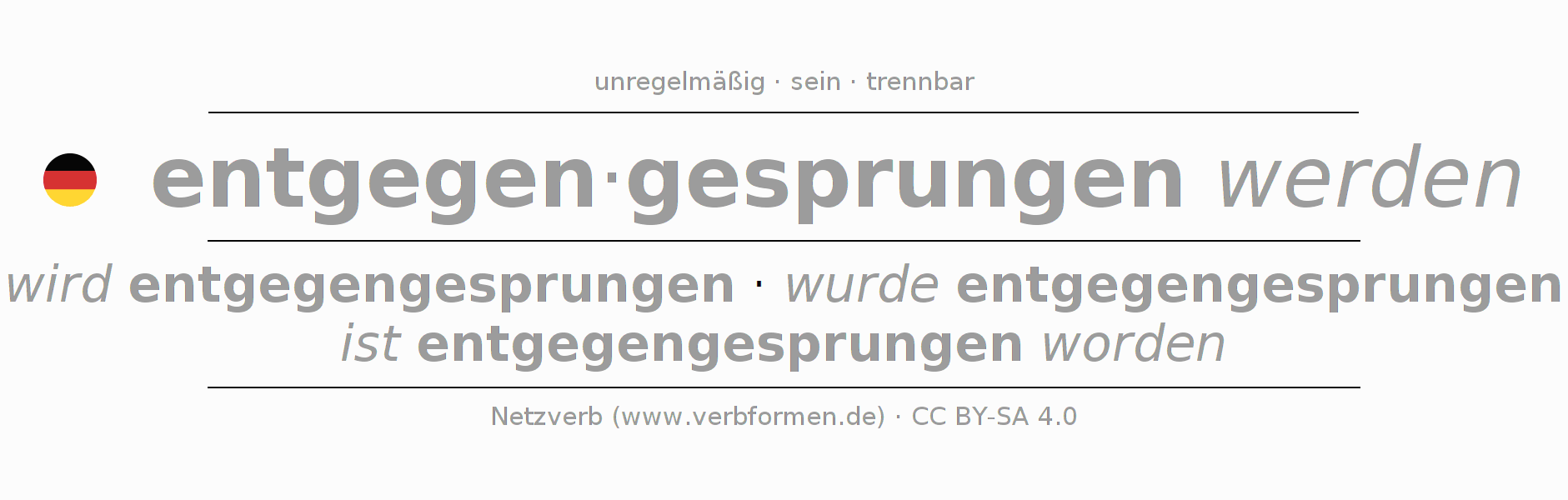 | ich | werde entgegengesprungen | wurde entgegengesprungen | werde entgegengesprungen | würde entgegengesprungen | - |