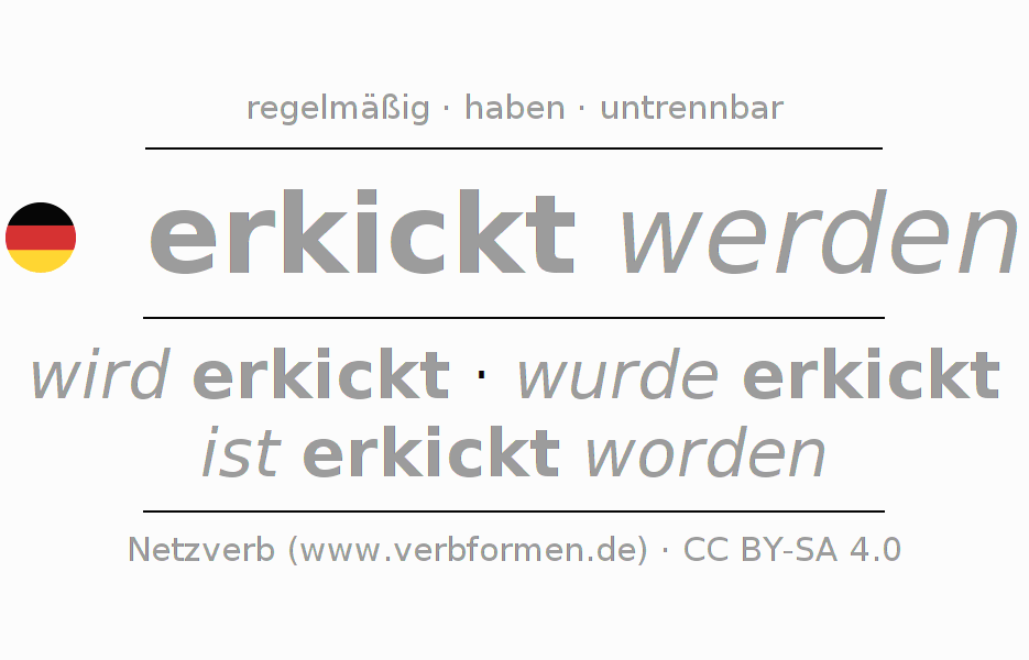- Futur I: ich werde erkickt werden, du wirst erkickt werden, er wird erkickt werden, wir werden erkickt werden, ihr werdet erkickt werden, sie werden erkickt werden