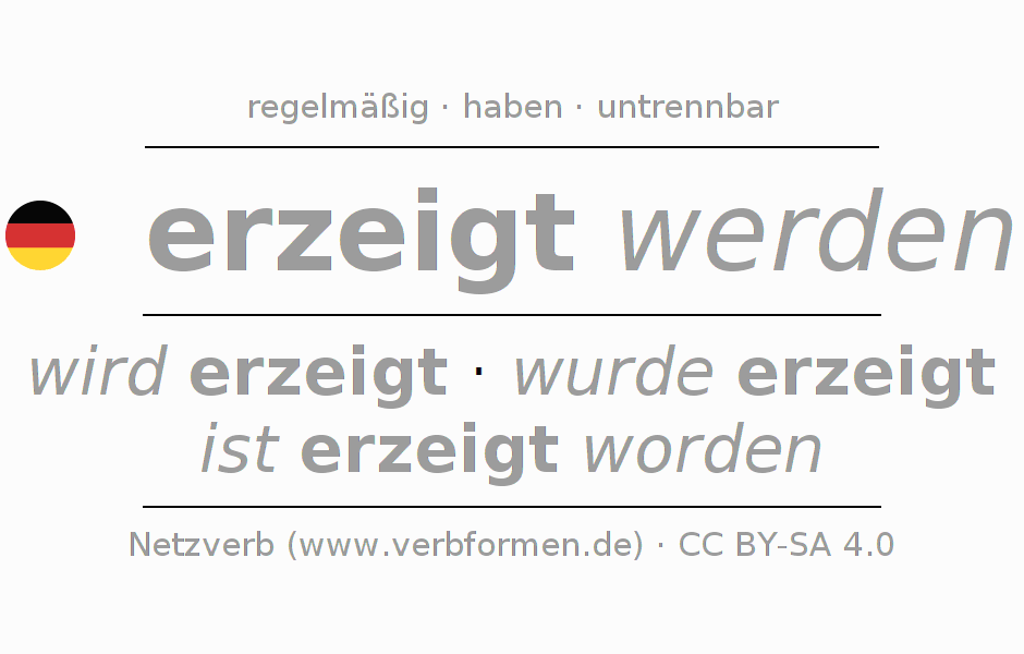 - Futur II: ich werde erzeigt worden sein, du wirst erzeigt worden sein, er wird erzeigt worden sein, wir werden erzeigt worden sein, ihr werdet erzeigt worden sein, sie werden erzeigt worden sein