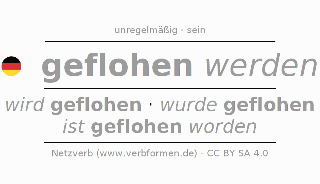 Die geflohen werden Konjugation online als Verbtabelle mit allen Verbformen in Singular (Einzahl) und Plural (Mehrzahl) in allen Personen (1. Person, 2.Person, 3. Person) übersichtlich dargestellt. Die Beugung bzw. Flexion des Verbs geflohen werden ist somit eine Hilfestellung für Hausaufgaben, Prüfungen, Klausuren, für den Deutschuntericht der Schule, zum Deutsch Lernen, für das Studium, Deutsch als Fremdsprache (DaZ), Deutsch als Zweitsprache (DaZ) und für die Erwachsenenbildung. Gerade auch für Deutschlernende ist die korrekte Konjugation des Verbs bzw. die korrekt flektierten Formen (wird geflohen - wurde geflohen - ist geflohen worden) entscheidend. Weitere Informationen finden sich unter Wiktionary fliehen und unter fliehen im Duden.