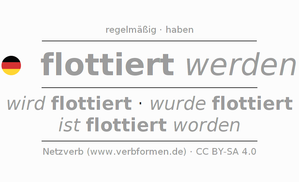 - Futur I: ich werde flottiert werden, du werdest flottiert werden, er werde flottiert werden, wir werden flottiert werden, ihr werdet flottiert werden, sie werden flottiert werden