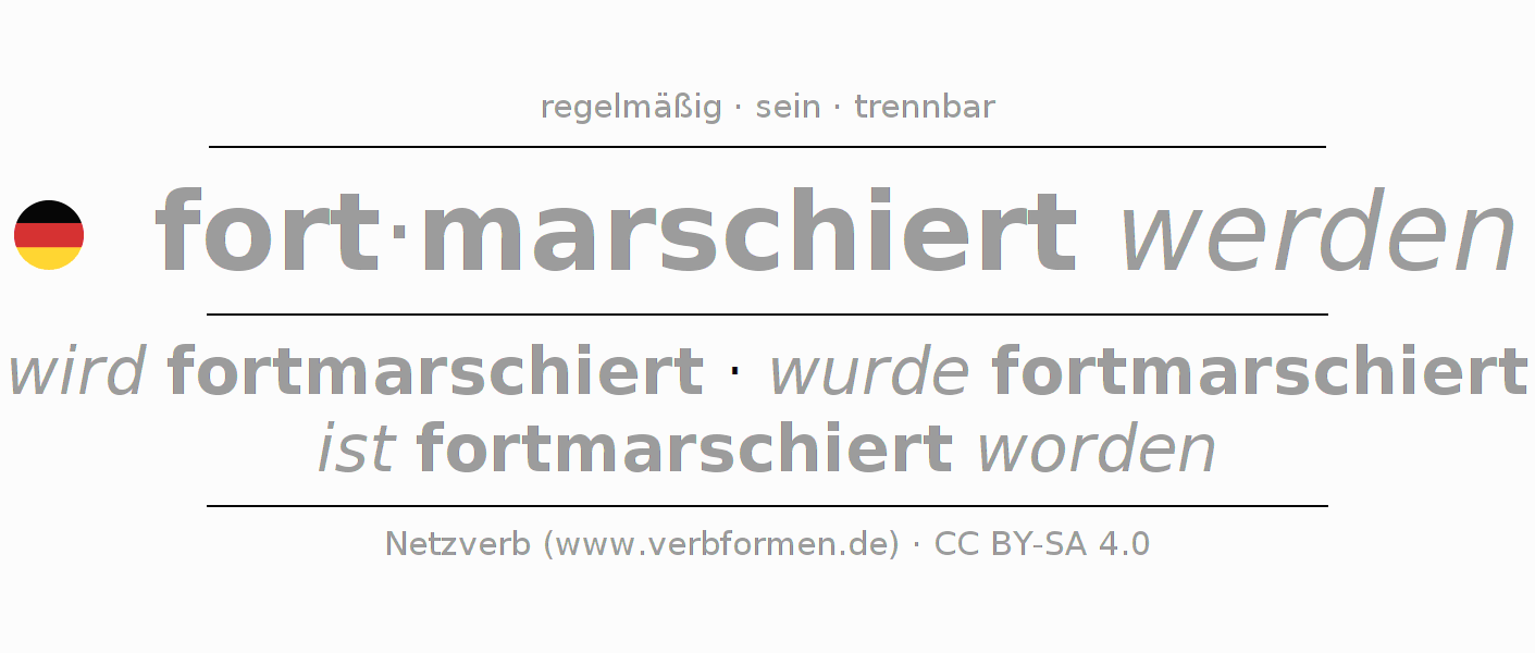 - Präsens: ich werde fortmarschiert, du wirst fortmarschiert, er wird fortmarschiert, wir werden fortmarschiert, ihr werdet fortmarschiert, sie werden fortmarschiert