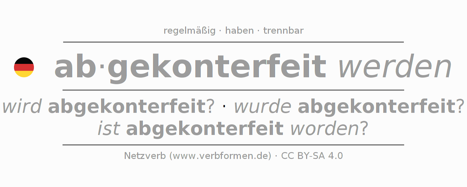 - Futur I: werde ich abgekonterfeit werden?, wirst du abgekonterfeit werden?, wird er abgekonterfeit werden?, werden wir abgekonterfeit werden?, werdet ihr abgekonterfeit werden?, werden sie abgekonterfeit werden?