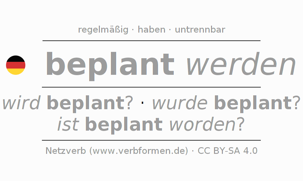 - Futur I: werde ich beplant werden?, wirst du beplant werden?, wird er beplant werden?, werden wir beplant werden?, werdet ihr beplant werden?, werden sie beplant werden?