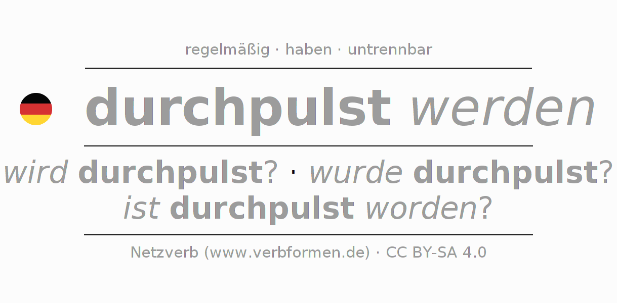 - Futur II: werde ich durchpulst worden sein?, wirst du durchpulst worden sein?, wird er durchpulst worden sein?, werden wir durchpulst worden sein?, werdet ihr durchpulst worden sein?, werden sie durchpulst worden sein?