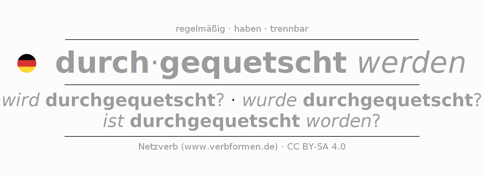 Das Konjugieren des Verbs durchquetschen erfolgt regelmäßig. Die Stammformen sind wird durchgequetscht?, wurde durchgequetscht? und ist durchgequetscht worden?. Als Hilfsverb von durchquetschen wird "haben" verwendet. Die Vorsilbe durch- von durchquetschen ist trennbar. Die Beugung erfolgt im Vorgangspassiv und die Darstellung als Fragesatz. Zum besseren Verständnis stehen unzählige Beispiele für das Verb durchquetschen zur Verfügung. Zum Üben und Festigen gibt es außerdem kostenlose Arbeitsblätter für durchquetschen. Man kann nicht nur durchquetschen konjugieren, sondern alle deutschen Verben. Kommentare ☆
