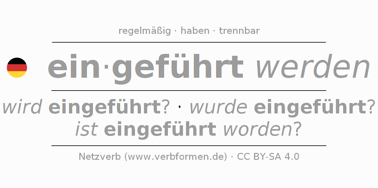Das Konjugieren des Verbs einführen erfolgt regelmäßig. Die Stammformen sind wird eingeführt?, wurde eingeführt? und ist eingeführt worden?. Als Hilfsverb von einführen wird "haben" verwendet. Das Verb einführen kann reflexiv genutzt werden. Die Vorsilbe ein- von einführen ist trennbar. Die Beugung erfolgt im Vorgangspassiv und die Darstellung als Fragesatz. Zum besseren Verständnis stehen unzählige Beispiele für das Verb einführen zur Verfügung. Zum Üben und Festigen gibt es außerdem kostenlose Arbeitsblätter für einführen. Man kann nicht nur einführen konjugieren, sondern alle deutschen Verben. Das Verb gehört zum Wortschatz des Zertifikats Deutsch bzw. zur Stufe B2. Kommentare ☆