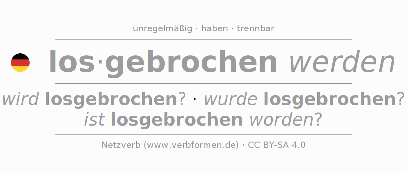 - Futur II: werde ich losgebrochen worden sein?, wirst du losgebrochen worden sein?, wird er losgebrochen worden sein?, werden wir losgebrochen worden sein?, werdet ihr losgebrochen worden sein?, werden sie losgebrochen worden sein?