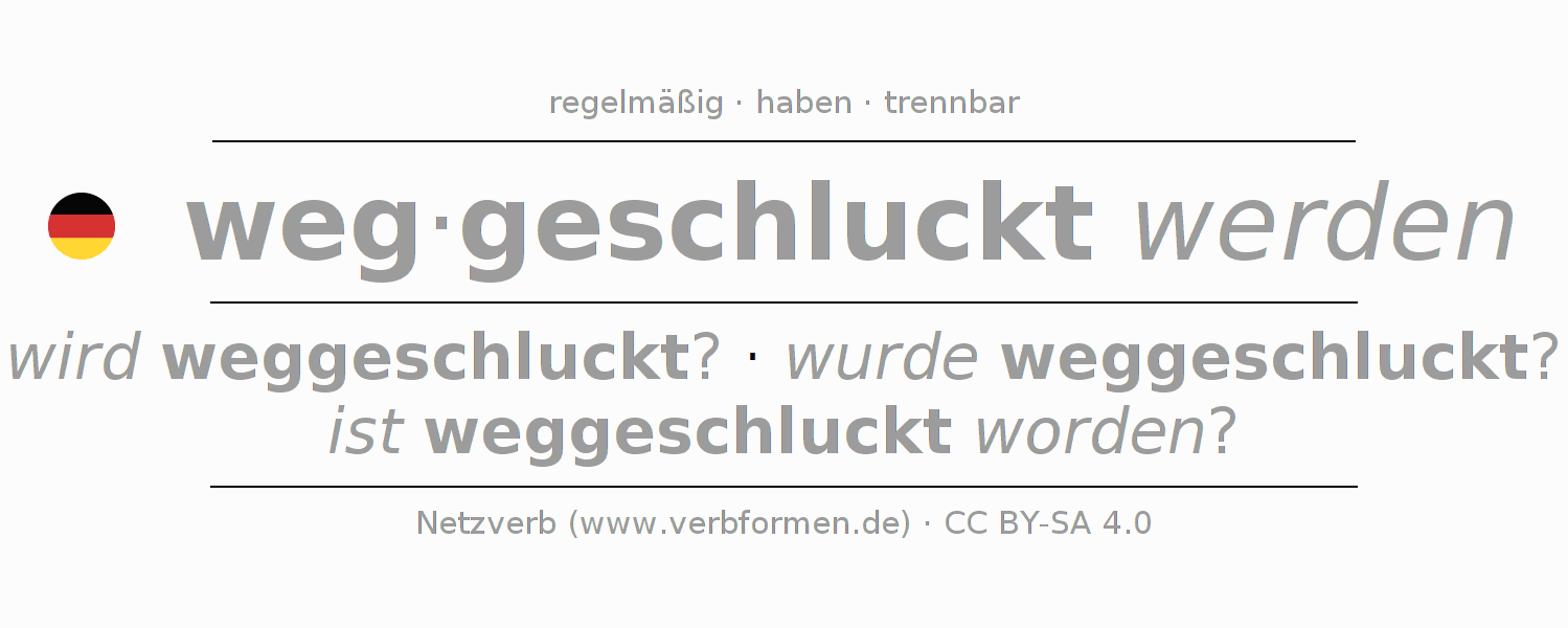 - Futur II: werde ich weggeschluckt worden sein?, wirst du weggeschluckt worden sein?, wird er weggeschluckt worden sein?, werden wir weggeschluckt worden sein?, werdet ihr weggeschluckt worden sein?, werden sie weggeschluckt worden sein?