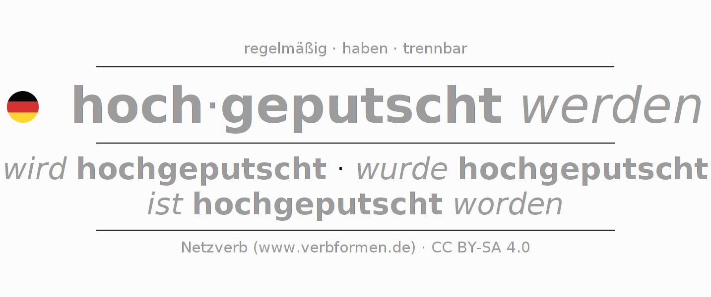 - Futur I: ich werde hochgeputscht werden, du wirst hochgeputscht werden, er wird hochgeputscht werden, wir werden hochgeputscht werden, ihr werdet hochgeputscht werden, sie werden hochgeputscht werden