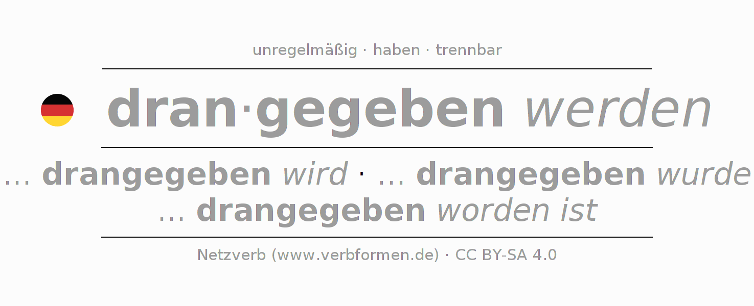 - Futur I: ... ich drangegeben werden werde, ... du drangegeben werden werdest, ... er drangegeben werden werde, ... wir drangegeben werden werden, ... ihr drangegeben werden werdet, ... sie drangegeben werden werden