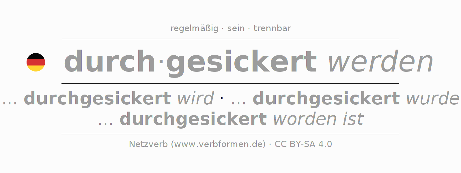 - Futur I: ... ich durchgesickert werden werde, ... du durchgesickert werden werdest, ... er durchgesickert werden werde, ... wir durchgesickert werden werden, ... ihr durchgesickert werden werdet, ... sie durchgesickert werden werden