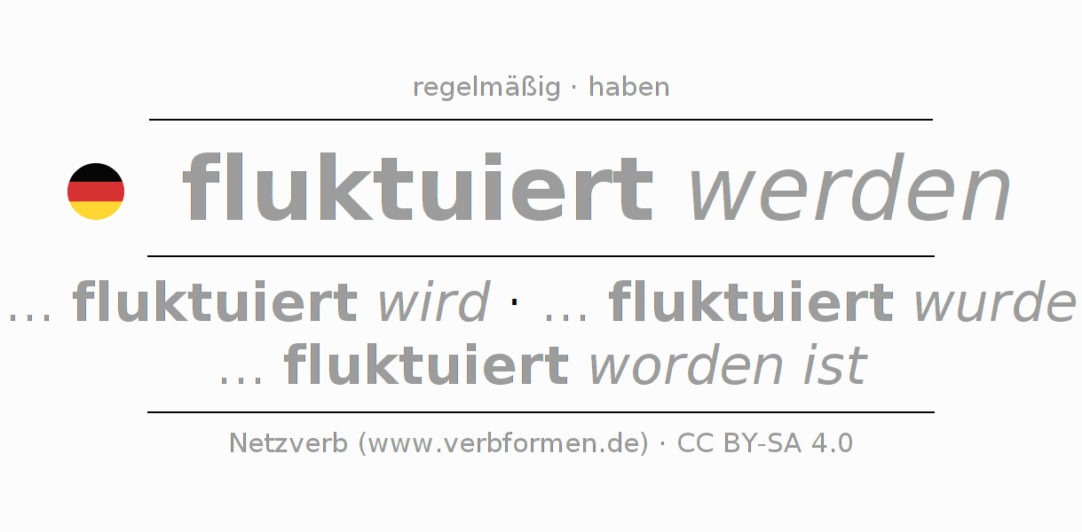 - Futur I: ... ich fluktuiert werden werde, ... du fluktuiert werden wirst, ... er fluktuiert werden wird, ... wir fluktuiert werden werden, ... ihr fluktuiert werden werdet, ... sie fluktuiert werden werden