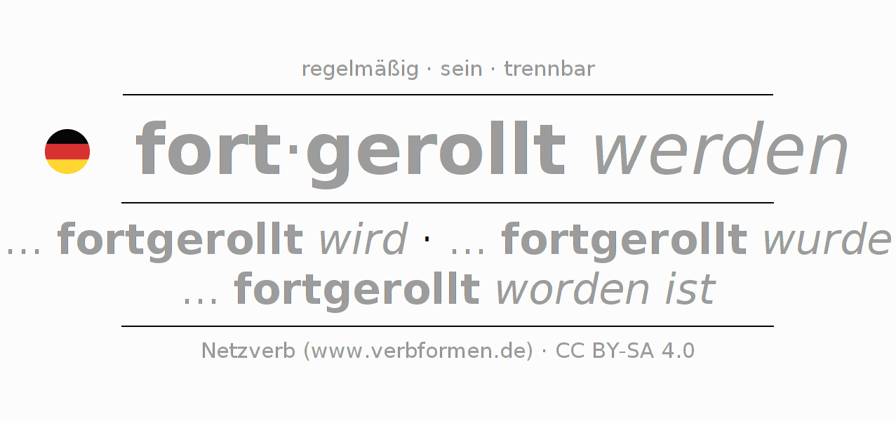 - Futur I: ... ich fortgerollt werden werde, ... du fortgerollt werden wirst, ... er fortgerollt werden wird, ... wir fortgerollt werden werden, ... ihr fortgerollt werden werdet, ... sie fortgerollt werden werden