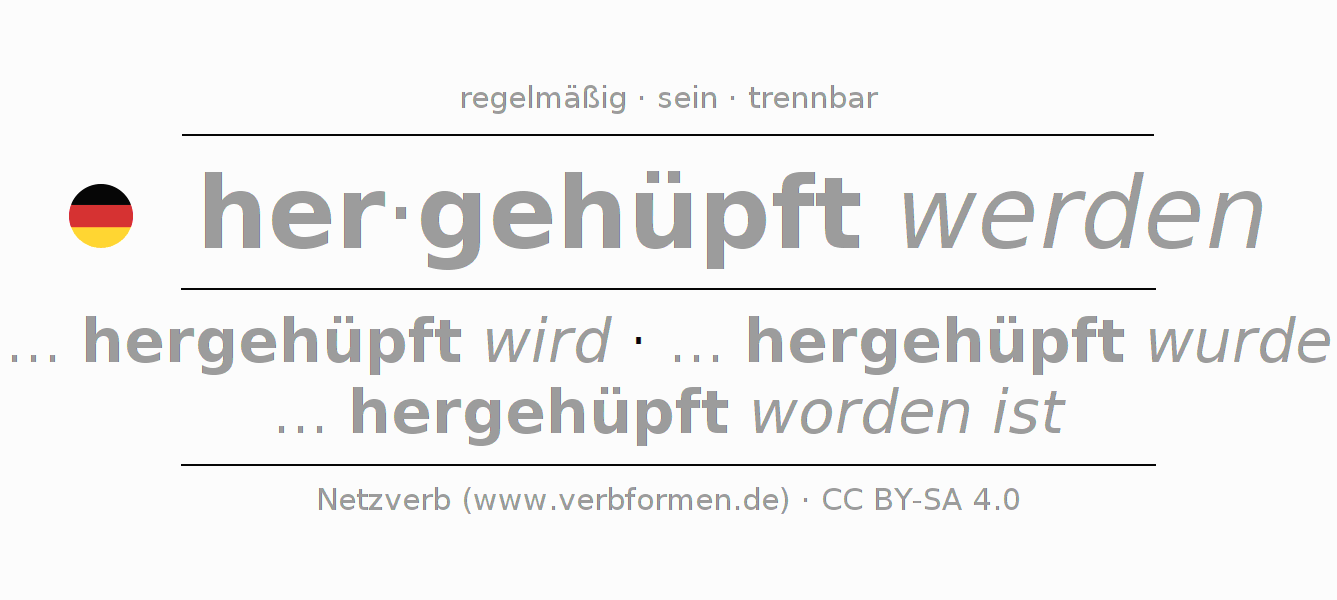- Futur I: ... ich hergehüpft werden werde, ... du hergehüpft werden wirst, ... er hergehüpft werden wird, ... wir hergehüpft werden werden, ... ihr hergehüpft werden werdet, ... sie hergehüpft werden werden