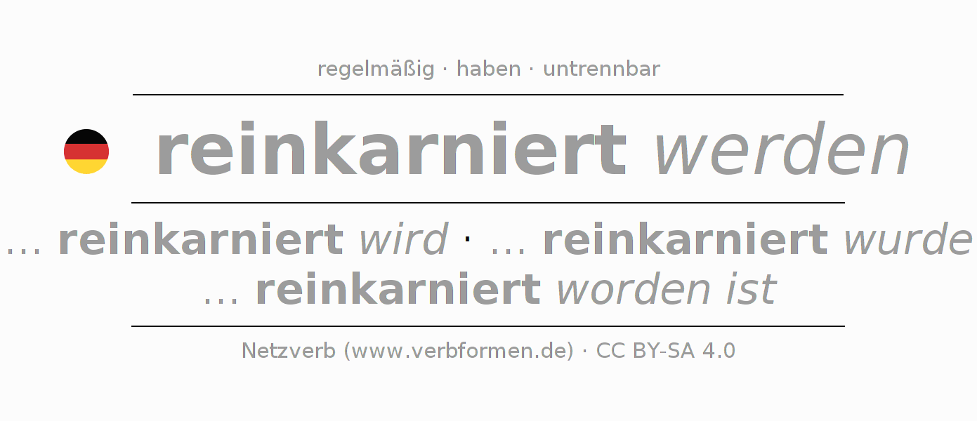 - Futur II: ... ich reinkarniert worden sein werde, ... du reinkarniert worden sein wirst, ... er reinkarniert worden sein wird, ... wir reinkarniert worden sein werden, ... ihr reinkarniert worden sein werdet, ... sie reinkarniert worden sein werden